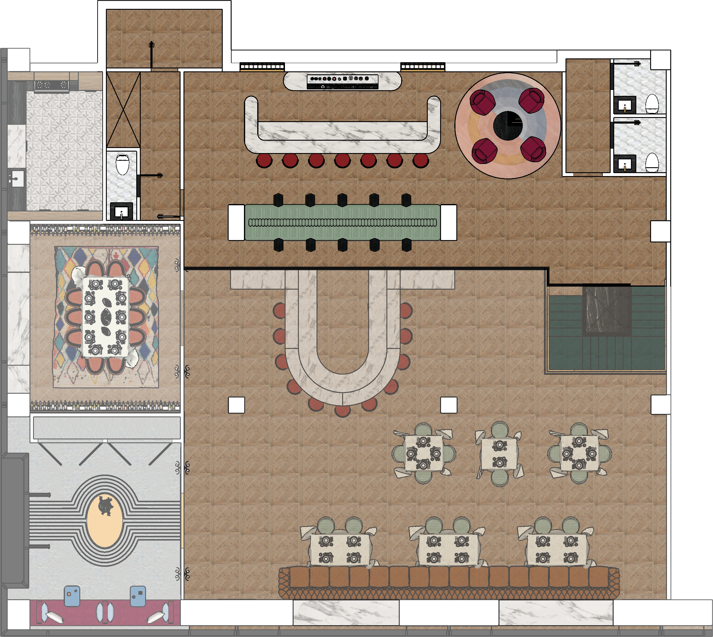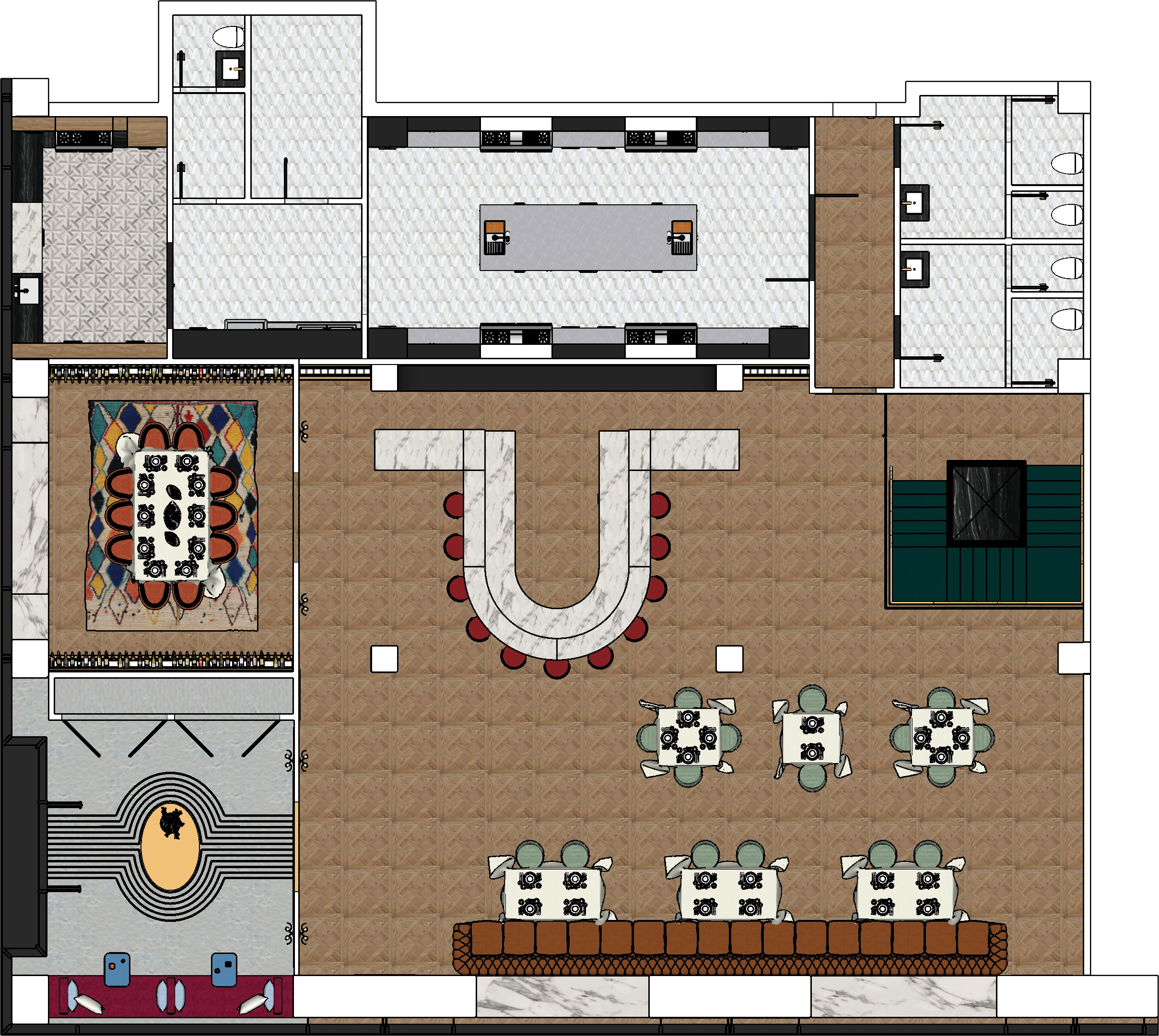 Located on the first floor of 5 Bryant Park, I created a restaurant/bar with members only private dining room & mezzanine whiskey bar/entertaining area. The kitchen includes a separate bakery that faces 40th street.